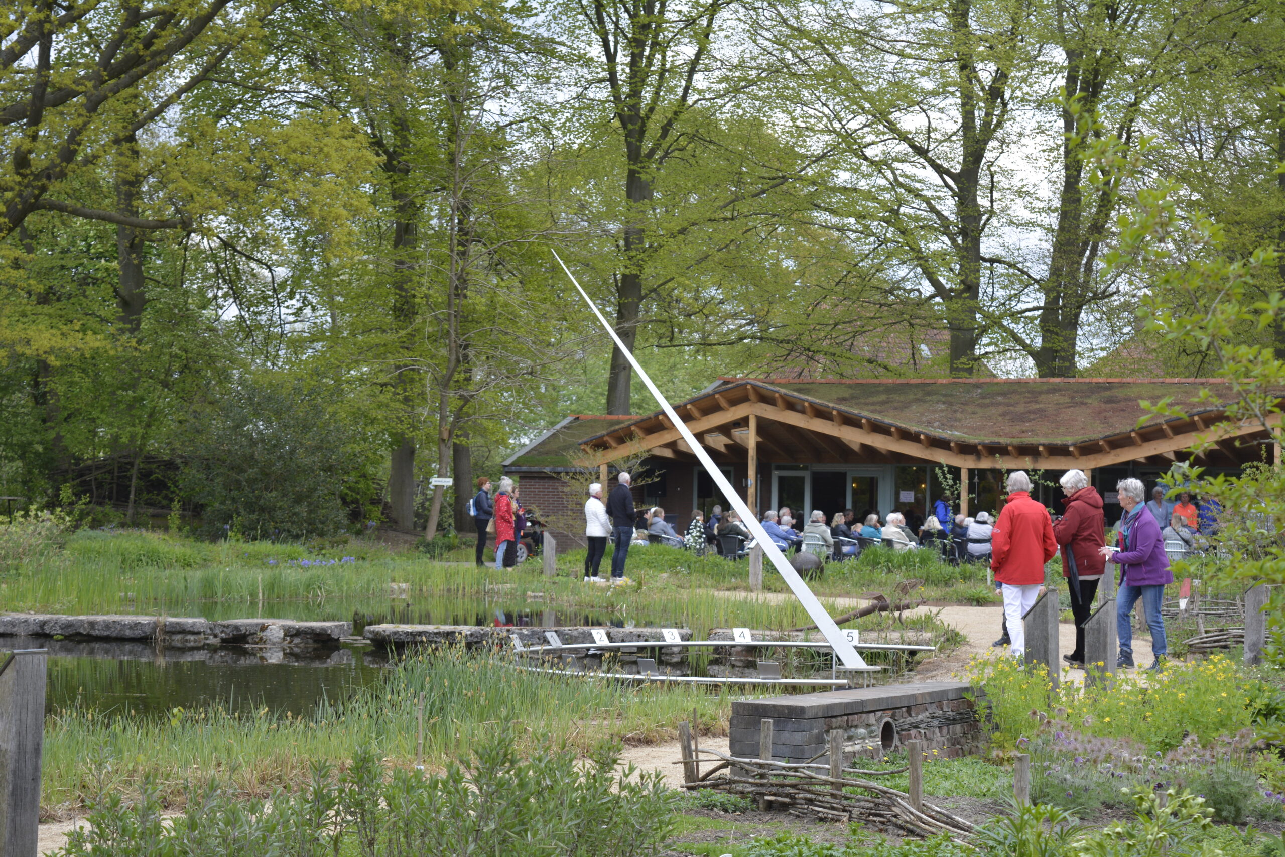 Het terras is geen los element, maar een natuurlijk verlengstuk van de kruidentuin zelf. Het ligt bij het bezoekerscentrum en kijkt uit over het groen, de vijver en de slingerende paden. Bezoekers horen het zachte geritsel van bladeren, het zoemen van bijen en het kabbelende water van de Berkel op de achtergrond.